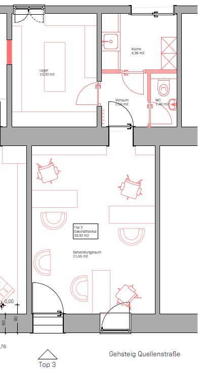Located on the main street Quellenstraße, and near multiple public transport stops, the shop will undergo a renovation. After the renovation, it will comprise of a bright commercial room (22m²), a storage room (10m²), a kitchen and a bathroom. The shop is cooled and heated through a reversible heat pump. An original rod iron gate provided is an additional security factor to the shop.
